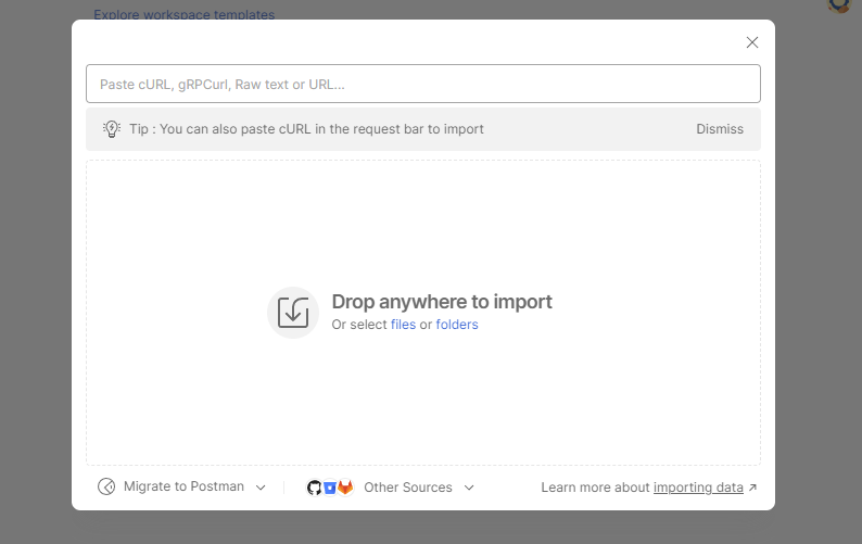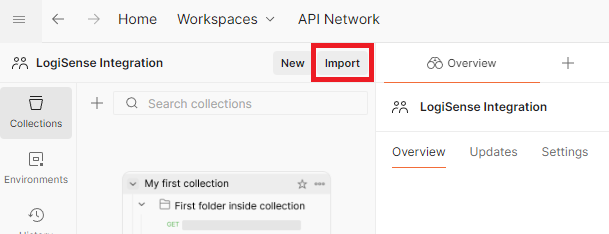 Open up your instance of Postman and go to the collections area of the desired workspace. From there select the Import button to import your downloaded OpenAPI specification file.