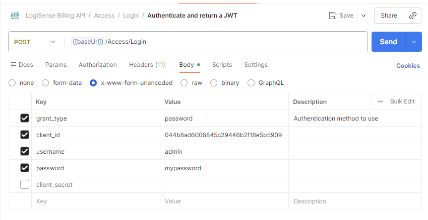 To retrieve your token open the Access/Login POST operation and navigate to the body tab. This is where you will fill in all the information for authorizing with the system. For details on which fields to fill in based on your authorization type please see our Tokens & Authorization information.