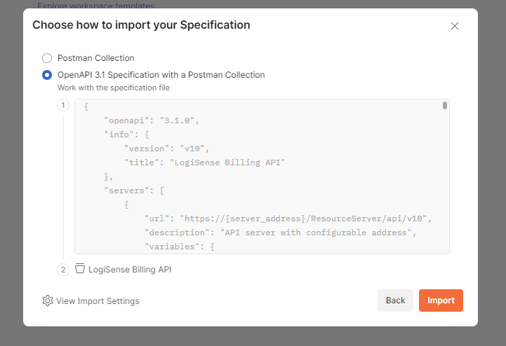 It will briefly process the file and then ask you how you would like to import your specification. Please select the OpenAPI 3.1 Specification with a Postman Collection option and then press Import.