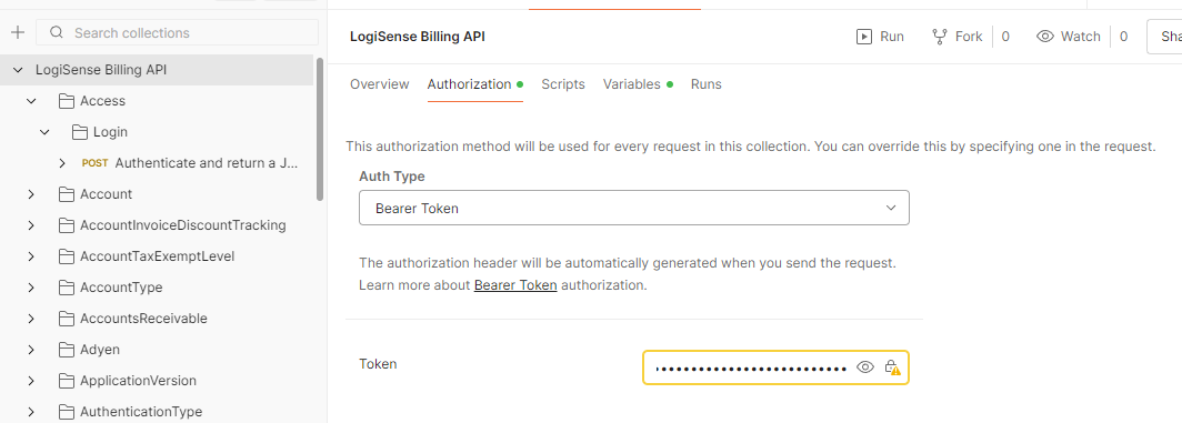 Now you will navigate back to the main LogiSense Billing API top node and select the Authorization tab. In the authorization tab you will find a field called Token. Delete any existing value in this field and paste in your copied token content.