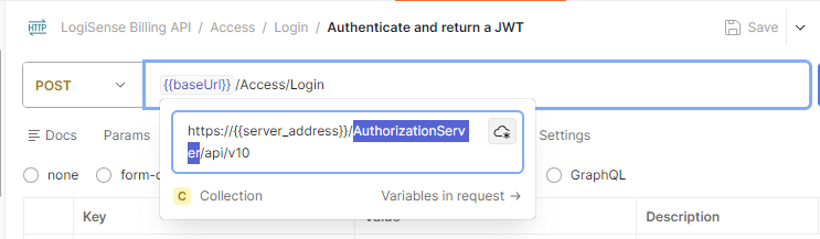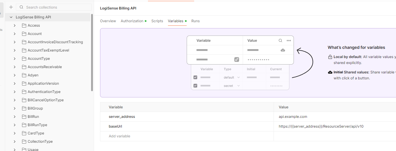 To initially configure your environment you can setup some different variables that will make calling APIs nice and simple. Select the LogiSense Billing API top level node and then select the Variables tab.